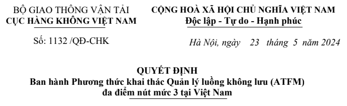 Quyết định Ban hành Phương thức quản lý luồng không lưu ATFM đa điểm nút mức 3 tại Việt Nam