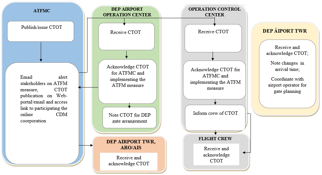 + Impact of CTOT and other ATFM measures (if any) on coordination, ATC and operation at airports and aerodromes;